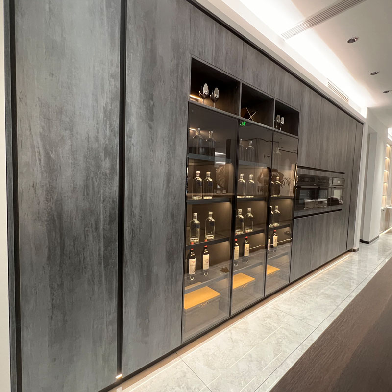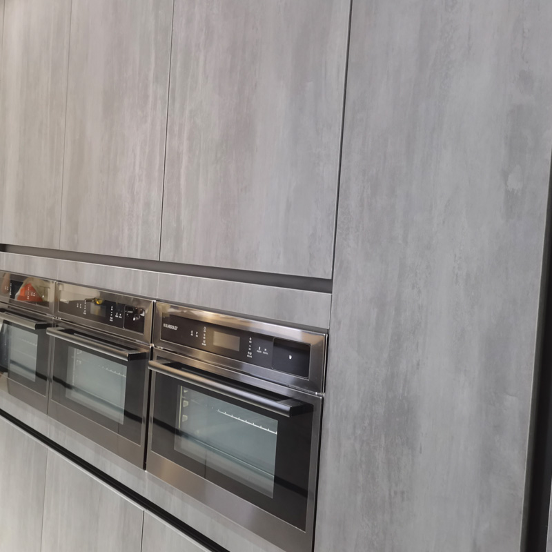 కొత్త స్టైల్ లామినేటెడ్ కిచెన్ క్యాబినెట్, రాక్ వెదర్ వంటి రంగు పాత ట్రీట్మెంట్, టచ్ ఫీలింగ్ స్మూత్ మరియు క్వాలిటీ, అల్యూమినియం ఫ్రేమ్తో మ్యాచింగ్ గ్లాస్ డోర్ ప్యానెల్, కిచెన్ డెకర్ ఎఫెక్ట్ యొక్క అధిక సెన్స్. మెటీరియల్ జలనిరోధిత సులభంగా శుభ్రంగా ఉంటుంది మరియు శైలి సులభం కాదు.