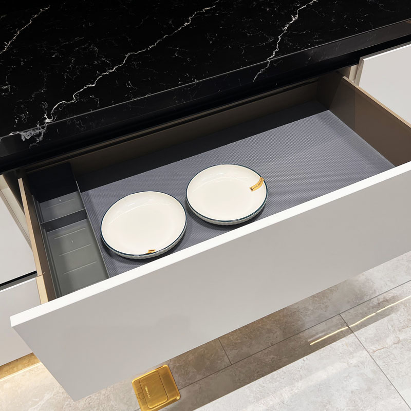 ఈ ఆధునిక వైట్ కిచెన్ క్యాబినెట్ల శ్రేణి పర్యావరణ అనుకూల చర్మ-అనుభూతి ఉపరితల చికిత్సను ఉపయోగిస్తుంది. ప్యానెళ్ల ప్రాథమిక పదార్థం జర్మనీ దిగుమతి చేసుకున్న టాప్ క్లాస్ ఇంటెలిజెంట్ ఆటోమేటిక్గా ప్రొడక్షన్ లైన్తో ముడి పదార్థంగా పైన్ చెక్కతో అధిక నాణ్యతతో తయారు చేయబడింది. మేము MDI (4-డిఫెనైల్మీథేన్ డైసోసైనేట్) జిగురును మాత్రమే ఉపయోగిస్తాము; అధిక-ఉష్ణోగ్రత ఉత్పత్తి ప్రక్రియలో ఫినైల్ అస్థిరంగా ఉంటుంది.
