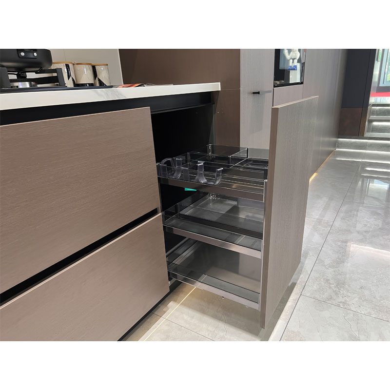 స్మార్ట్ కిచెన్ హై-ఎండ్ లామినేట్ కిచెన్ క్యాబినెట్లు బ్రౌన్ను అంతటా ప్రధాన రంగుగా ఉపయోగిస్తాయి మరియు మాట్టే ఆకృతి విజువల్ మరియు హ్యాండ్ ఫీలింగ్లో మరింత అధునాతనంగా ఉంటుంది. సాధారణ మరియు అసాధారణ పరిమాణాలు రెండూ అందుబాటులో ఉన్నాయి మరియు l-, L- మరియు U- ఆకారపు క్యాబినెట్లను క్యాబినెట్ మరియు కౌంటర్ టాప్ మెటీరియల్స్ మరియు రంగుల ఉచిత ఎంపికతో అనుకూలీకరించవచ్చు.